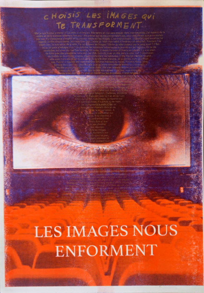 Moi je suis là pour y croire ! // La vidéo a un impact. Elle rentre en moi sans toquer, dans mes émotions. J’ai ressenti de la colère et de la tristesse tellement fort pour des scènes qui ne me concernaient pas, pour des choses que je ne voulais pas voir. Il y a beaucoup d’argent et de pouvoir misés sur les images. C’est trop puissant. // Quand j’étais enceinte j’ai regardé un film d’épouvante. Je n’avais pas peur, j’aime ça. Mais mon bébé à l’intérieur se débattait. Pourtant il ne voyait rien. Je suis sortie de la salle. Par où passent les images ? Est-ce qu’elles passent par le sang aussi ? // Est-ce qu’on peut s’habituer à ça ? La violence, les émotions fortes toutes la journée sur les réseaux. On se désensibilise, oui sinon ce n’est pas tenable. On mute. // Avant l’arrivée d’Obama au pouvoir il y a eu plein de films avec des présidents noirs pour les USA. Ça a dû jouer un rôle dans le vote, non ? L’évolution du monde se nourrit des images, elles transforment les habitudes. // Ma fille est métisse. Quand elle avait 3 ans elle rêvait toutes les nuits qu’elle était blanche. Je lui parlais, mais ça suffisait pas. Puis on a regardé des clips avec des femmes métisses ou noires. Princess Nokia. Nina Simone (Ain’t got no/ I got life), elle joue au piano entourée de blancs qui l’écoutent. Ma fille voulait toujours revoir cette vidéo. Elle s’en rappelle encore aujourd’hui. En tout cas maintenant elle rêve qu’elle est métisse. // Un jour, nous étions au musée avec mon fils. Il y avait un film 3D sur les dinosaures. C’était tellement violent qu’il gémissait et pleurait en silence. Je lui ai mis mes mains sur les oreilles, mais je ne suis pas sortie. Je me suis dit, peut-être qu’il faut qu’il apprenne, il faut qu’il s’habitue ? Être sensible comme ça ça va pas Mais pourquoi s’habituer en fait ? On doit apprendre à dépasser ses peurs dans la vraie vie, mais en image, est-ce que c’est nécessaire ? // Mon ami, il est accro à des chaînes de discussion Telegram. Cadavres, accidents de voiture. En discutant avec lui il se dit qu’il est accro oui en fait. Ces images, ça répond aussi à quelque chose. Il a jamais vu de mort. Se confronter à la mort. C’est un besoin à un moment dans sa vie, non ? Moi j’ai eu ce besoin. À l’époque j’ai pas pensé aux vidéos. Si tu cherches à te confronter à des trucs durs et que tu vas chercher tes réponses dans les images, à un moment tu vas sentir que t’as pas vraiment accompli le truc ? À un moment tout ce qui te reste comme émotions, c’est la honte. // Toi tu penses qu’il y a des choses qui doivent rester cachées. Invisibles. Dans nos relations au sensible, au monde. Tu trouves qu’on prend beaucoup trop de photos. Dans l’écriture, il y a une part qui est cachée. Ça ouvre à une interprétation vaste. Ça te pousse à ne pas être soumis à la vision. Avec les images aussi, on peut ne pas tout dévoiler : suggérer, garder des mystères. Ne pas être soumis à la vision, oui j’aimerai bien avoir ce pouvoir. Ne pas chercher à tout connaitre, comme si tout voir c’était suffisant. // Mon ex, 25 ans, m’a dit : « Les images m’enlèvent mon énergie. Je ne veux pas être pris en photo, je ne veux pas regarder de film. Ce que j’ai le désir de voir, c’est ce que je veux vivre. Je veux le voir en vrai. Je ne veux pas perdre ce courage d’affronter mes fantasmes. » Il est mort jeune, d’une vie très intense. Parfois je me demande si le manque d’image l’a tué ? // Tu dis que voir l’image ça enflamme ta rage et après t’es plus calme. Parfois ça te fait taire pour rien. Parfois c’est nécessaire. Quand le tourbillon est trop fort, parler ne suffit pas. Des images rentrent en toi, direct dans tes émotions et c’est de ça dont tu avais besoin. Et tu peux aussi t’en servir toi-même ! // Maintenant, c’est moi qui vais vers les images. Je vais vers les images que je veux rencontrer, passer du temps avec. J’évite celles qui s’incrustent sans prévenir, celles qui m’emmènent dans des endroits où je ne veux pas aller. C’est moi qui tiens la barre. Enfin, j’essaie. // Oui, je suis là pour y croire !