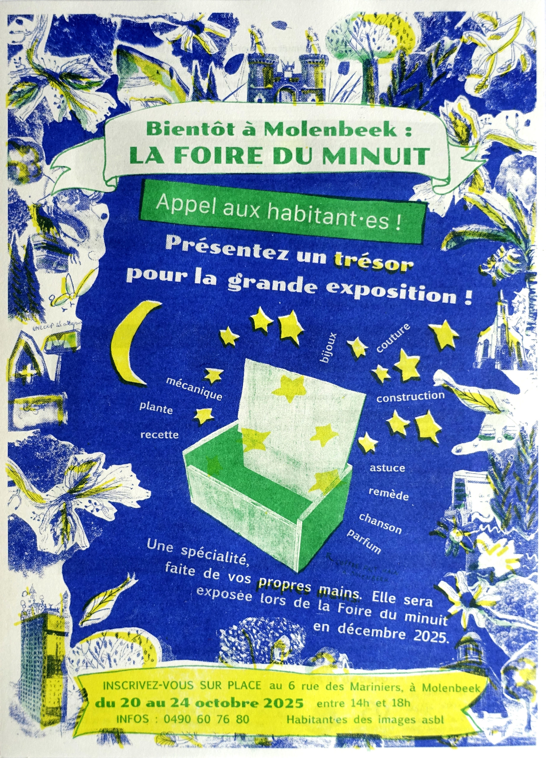 Du 15 au 20 décembre 2025 une « Foire du Minuit» sera organisée à la Porte de Ninove à Molenbeek. Elle sera composée de stands et d’animations nés de l’imagination des habitant·es pour valoriser les savoir-faire du quartier. Une grande fête au Nord de la gare du Midi pour imaginer d’autres manières de faire l’économie à l’échelle locale. Une fête pour parler d’emploi en dehors de grands discours politiques, mais concrètement depuis chez nous !